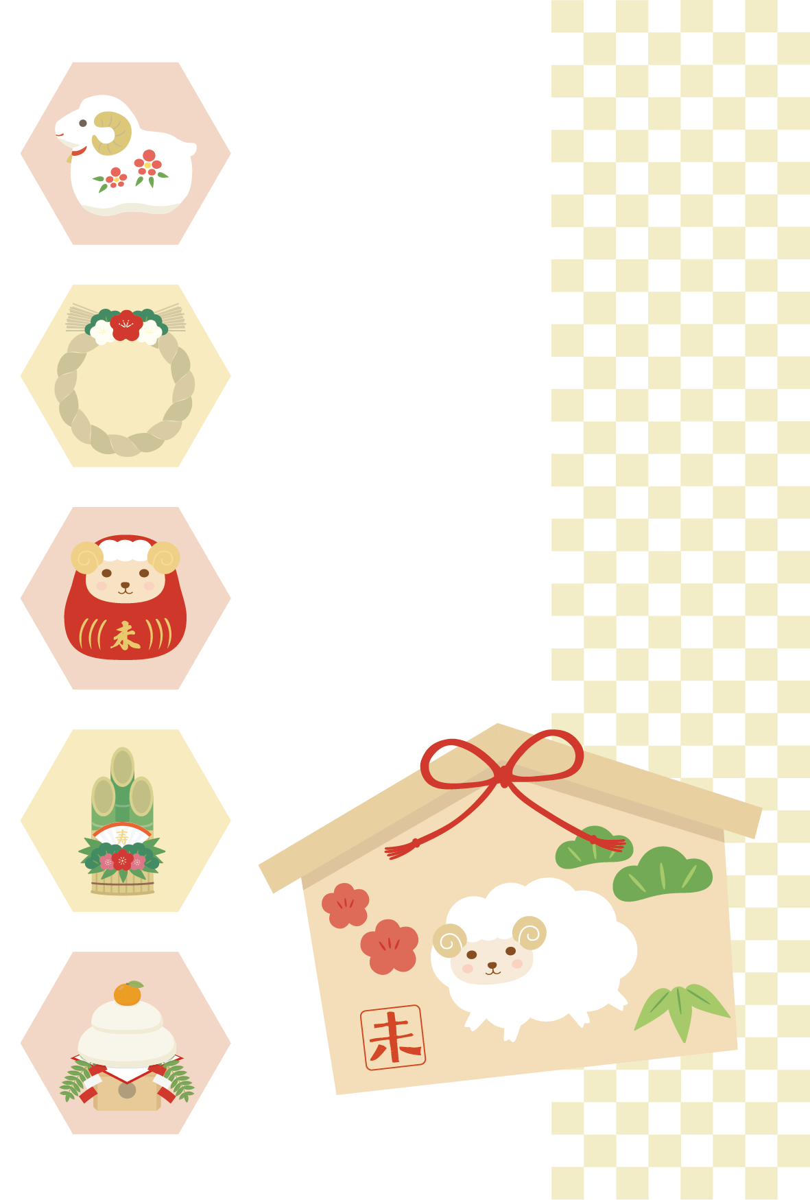 干支の未(ひつじ)の絵馬やだるま(達磨)、鏡餅などを組み合わせた可愛らしいデザインの年賀状なので、