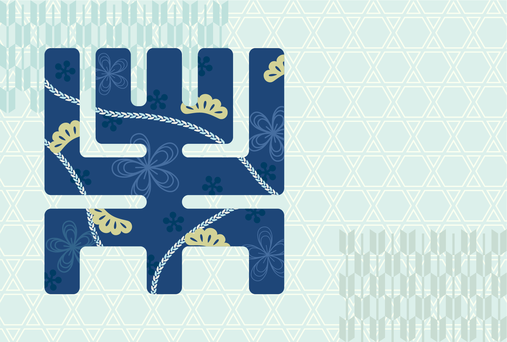 古字風の「未」といろいろな伝統文様(和柄)を背景にデザインした年賀状なので、